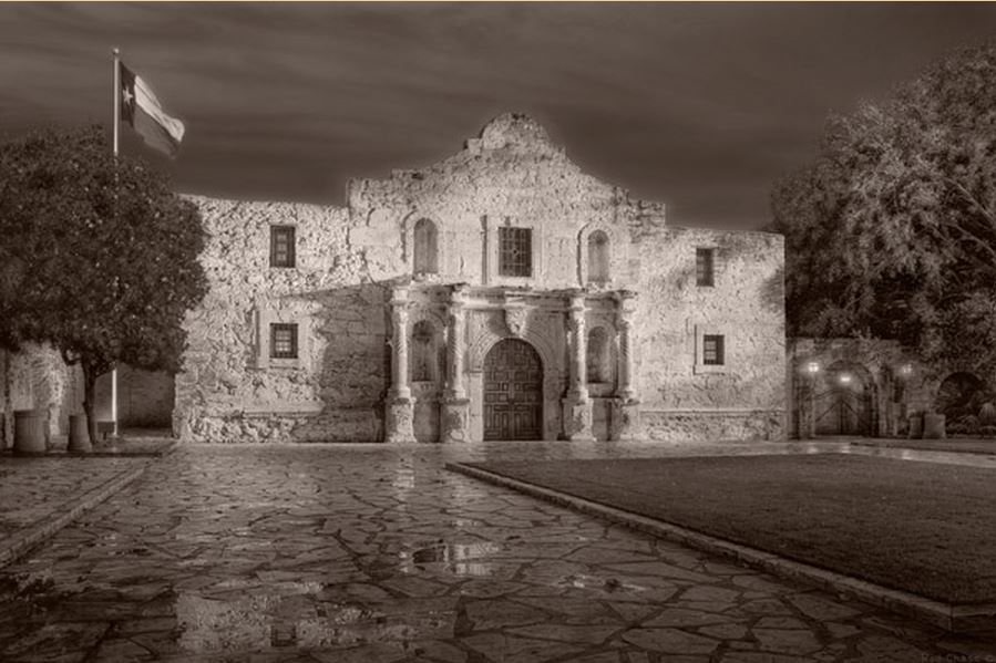 Sepia print of the Alamo by photorealist artist Rod Chase